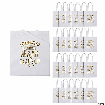 β’ Durable Quality: Made of cloth, this sturdy tote bag wonβt let you or your accessories down. Plus, you can easily store the reusable bag away until you need it again. β’ Eco-Friendly: Ditch the plastic bags and go green with this eco-friendly tote bag! Mother Earth is sure to appreciate the gesture, so go ahead and gift this tote bag to your friends and family while youβre at it! β’ Travel-Friendly: No matter where your day takes you, this tote bag is sure to be a handy companion! Designed with easy-to-use straps and a spacious interior compartment, this tote bag is ready for on-the-go fun! Product Description:Give wedding guests a gift theyβll not only remember but re-use for years to come! These personalizable white wedding tote bags are the perfect thank-you gift for members of your wedding party, out-of-town loved ones and other VIP guests. Fill them with wedding favors or make them extra special with custom gifts for each recipient. Β© OTCSize: 15″ x 17″ with 10″ handles.Quantity: 24Material: Nonwoven polyester.Personalize with 3 lines of text.
